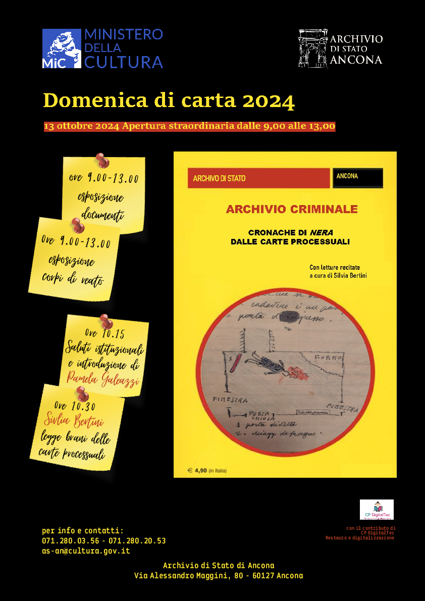 Domenica 13 ottobre, in occasione dell’annuale “Domenica di Carta”, l’Archivio di Stato proporrà l’evento “Archivio Criminale. Cronache di Nera dalle carte processuali”, con una mostra documentaria aperta al pubblico dalle ore 9,00 alle 13,00 e letture recitate alle ore 10,30.