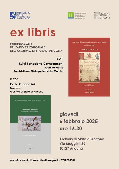 L’Archivio di Stato di Ancona, nell’ambito delle attività di valorizzazione del proprio patrimonio documentario, Giovedì 6 febbraio, alle ore 16,30, presso la Sala di studio, presenterà due pubblicazioni edite a cura dell’Istituto alla fine del 2024.