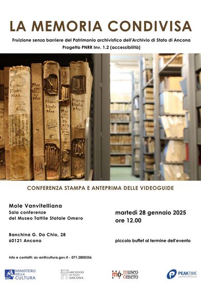 L’Archivio di Stato di Ancona, nell’ambito del progetto PNRR La memoria condivisa: fruizione senza barriere del patrimonio archivistico ideato in collaborazione con il Museo Tattile Statale Omero, ha realizzato tre videoguide accessibili realizzate per promuovere la conoscenza delle documentazioni conservate in Istituto e dei servizi culturali offerti al pubblico. I video sono stati realizzati dalla Peaktime Marketing&Comunicazione Srl.