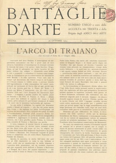 Di questa vicenda dà conto il documento proposto questo mese: un articolo pubblicato su “Battaglie d’Arte - Numero unico a cura della Accolta dei Trenta e della Brigata degli Amici dell'Arte”, uscito il 26 ottobre 1924. A scriverlo è Aristide Boni, presidente della Accolta dei Trenta, associazione che promuoveva il restauro e la conoscenza dei monumenti della città di Ancona.