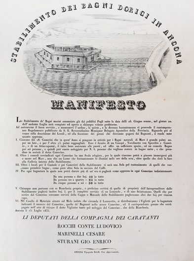 Archivio del Comune di Ancona, Editti, bandi, notificazioni e proclami a stampa, b. 6417 c. 13, Manifesto dello Stabilimento dei bagni dorici in Ancona, 15 luglio 1835